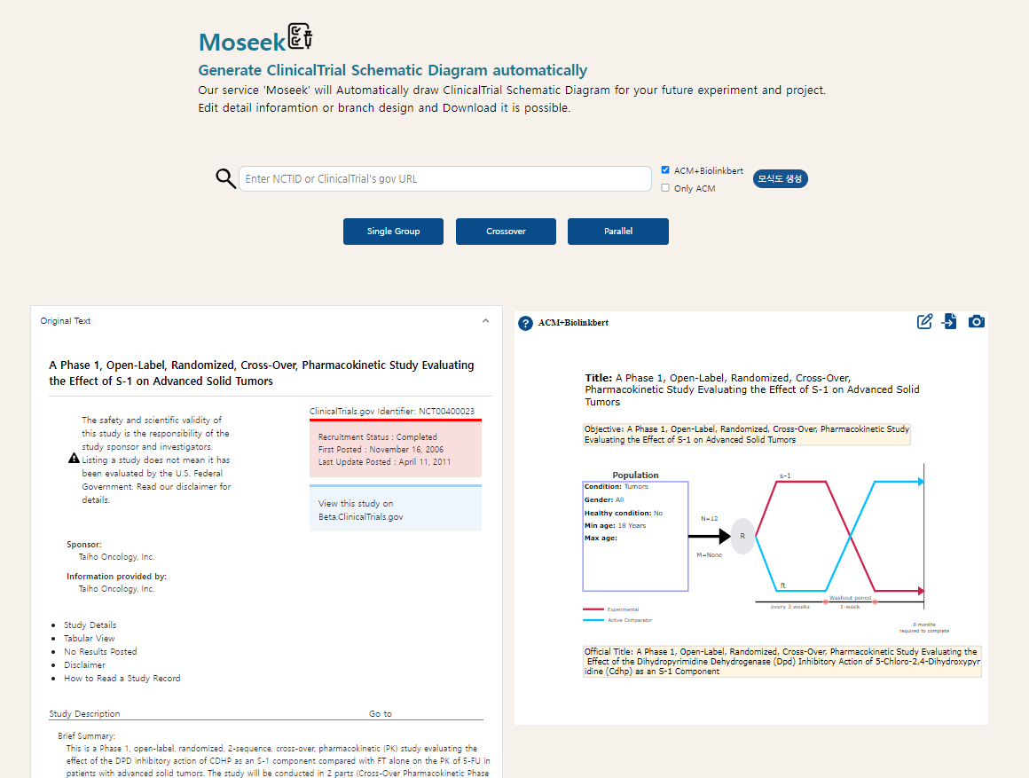 - NCT_ID 및 ClinicalTrials.gov URL 로 검색해 해당 임상시험 설계 정보를 모식도로 한 눈에 파악할 수 있음.