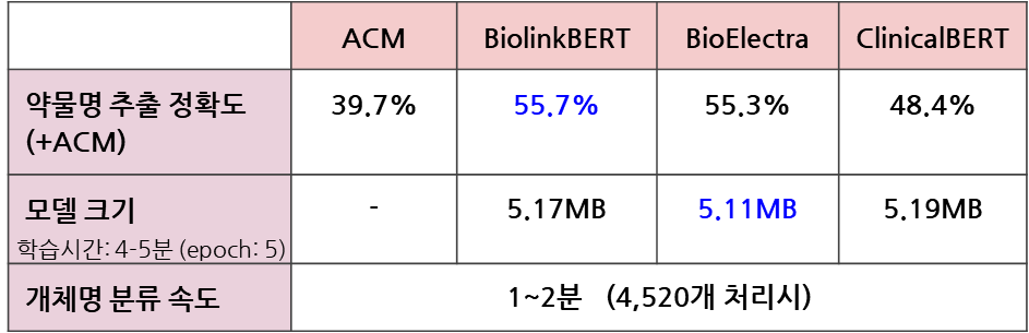 - 평가지표: 약물명의 추출 정확도 (Recall), 학습 속도, 모델 크기