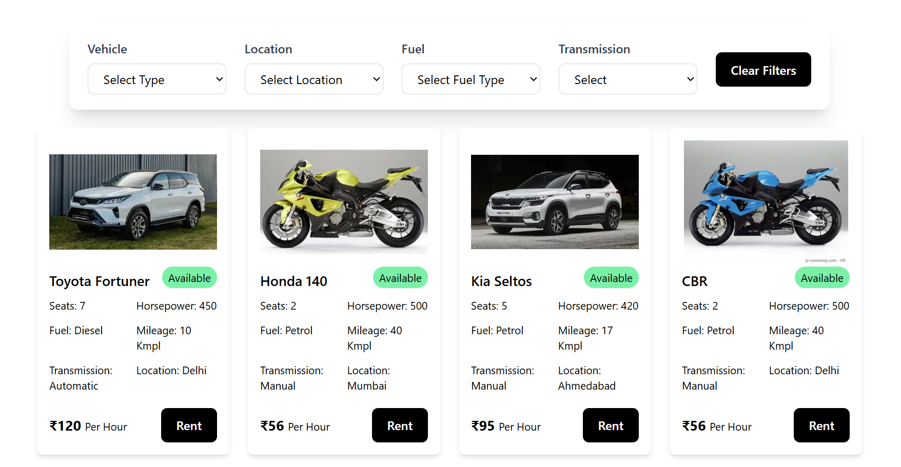 - Browse vehicles by location, type, fuel, and transmission