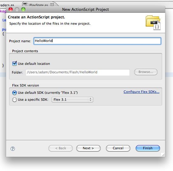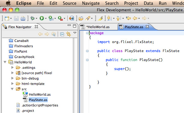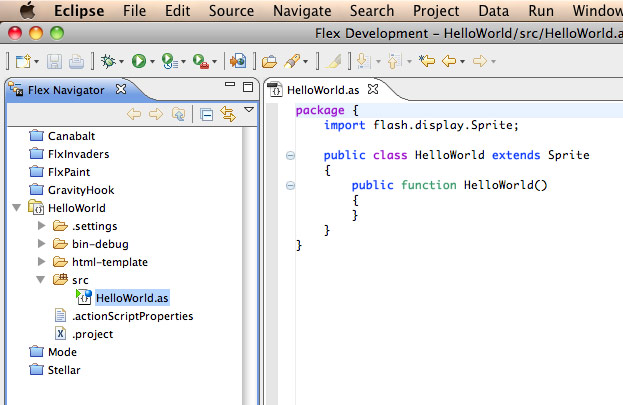 NOTE: My Flash-coding weapon of choice is something called Flex Builder. Flex Builder is both a standalone app and plug-in for the popular Java-based IDE Eclipse. I prefer the plug-in version personally, but they’re pretty comparable. The best thing about Flex Builder is that even though Adobe makes it, it’s pretty great, and buying a Flex Builder license gets you access to either version of the software on both Windows and Mac. Pretty rad! You can easily find out more about Flex Builder by getting your google on.