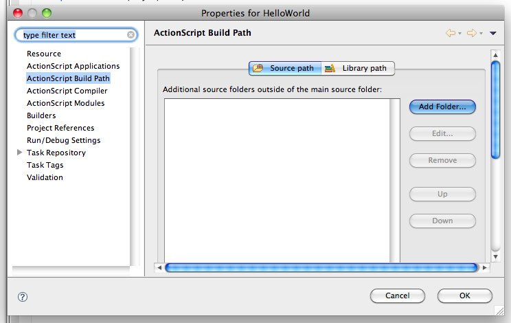 STEP 2.2: Clicking on that should pop up the Project Properties dialog, which looks something like this after you select ActionScript Build Path from the list on the left:
