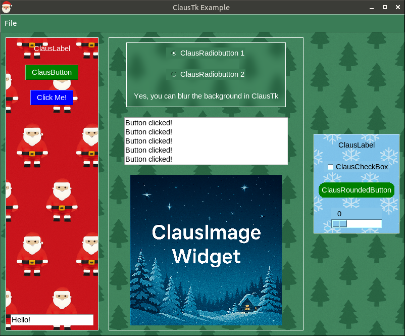 ClausTk is a library for creating New Year and Christmas interfaces using Tkinter.Highlights