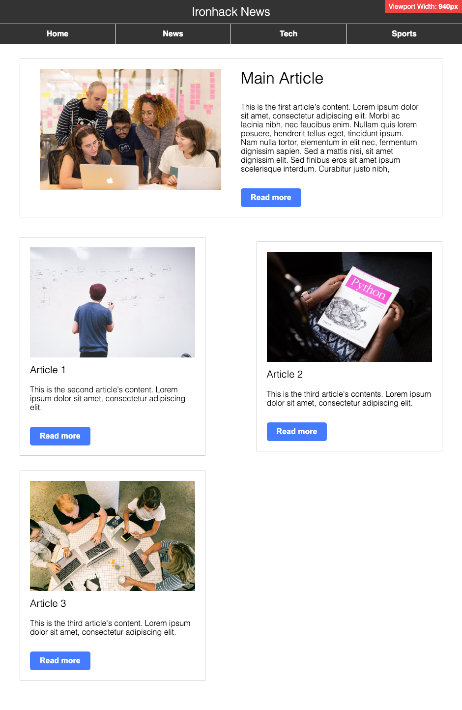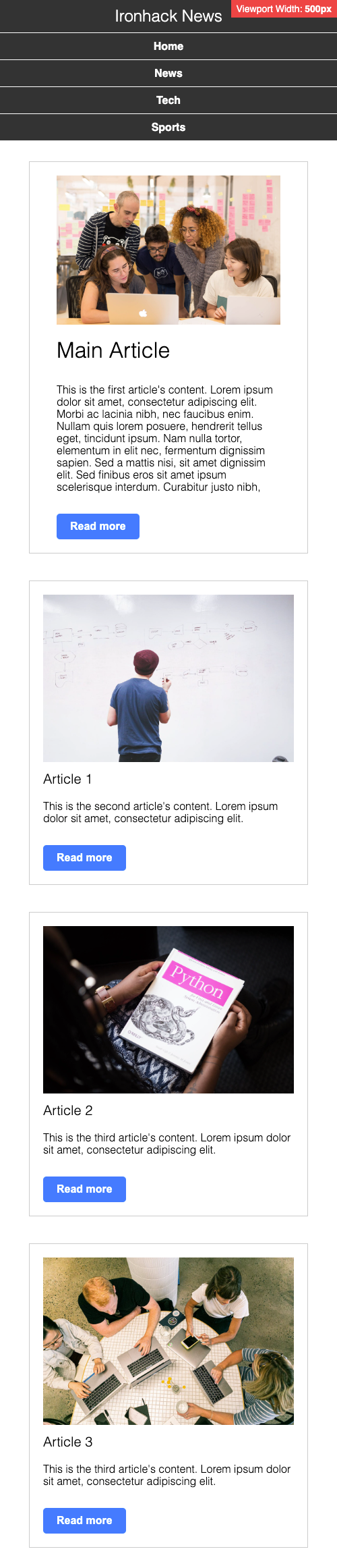 As a web developer, one of your tasks will be to make sure that the web pages and websites you build look good and work well on all devices and screen sizes. In this exercise, we will work on the Ironhack News web page, and your task is to make it fully responsive using the media queries and Flexbox knowledge you learned in the previous lessons.