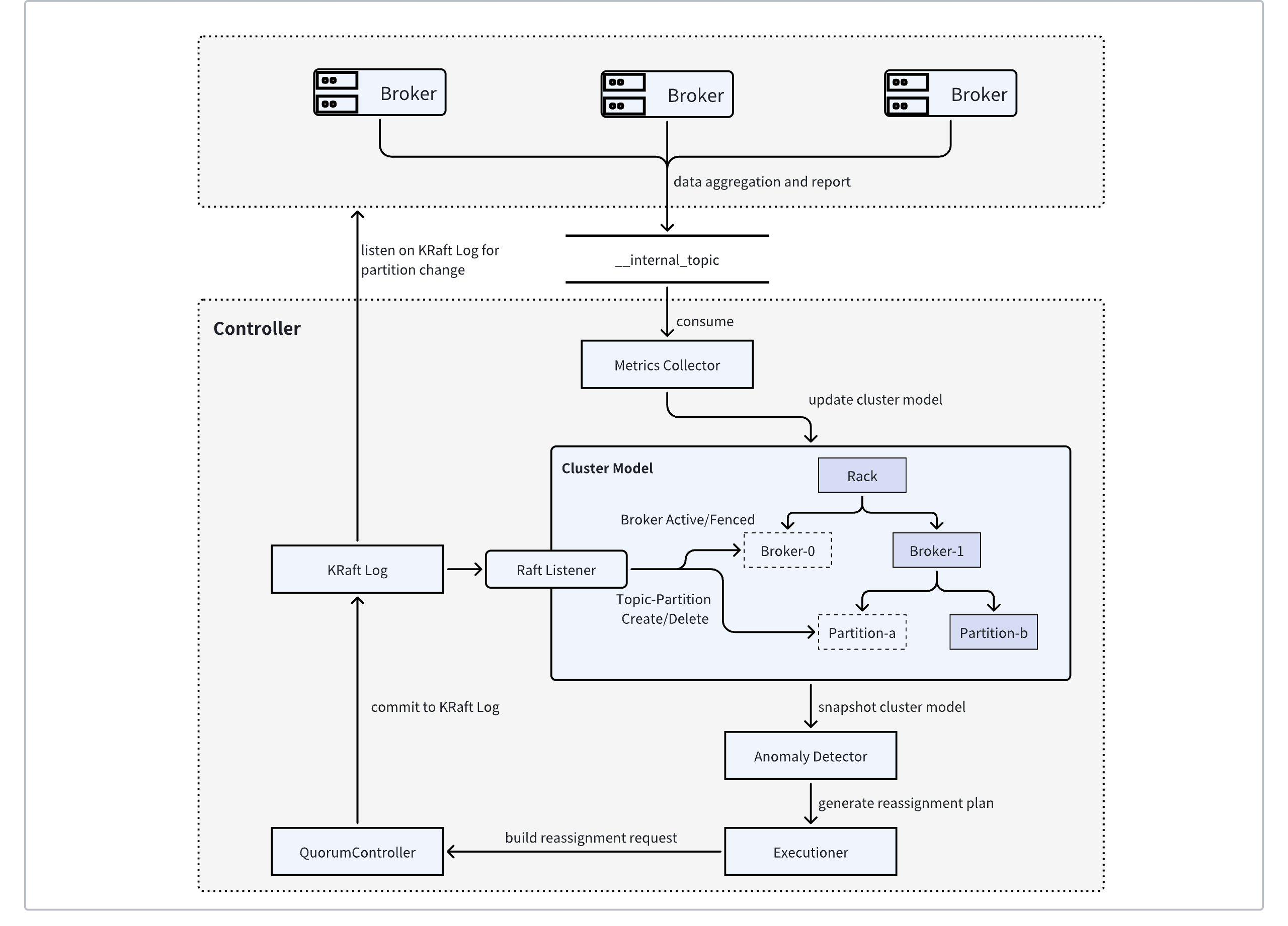 The figure above is the architecture diagram of AutoMQ's built-in Auto Balancing component. This architecture collects cluster metrics, automatically generates partition reassignment plans, and continuously balances the cluster's traffic.