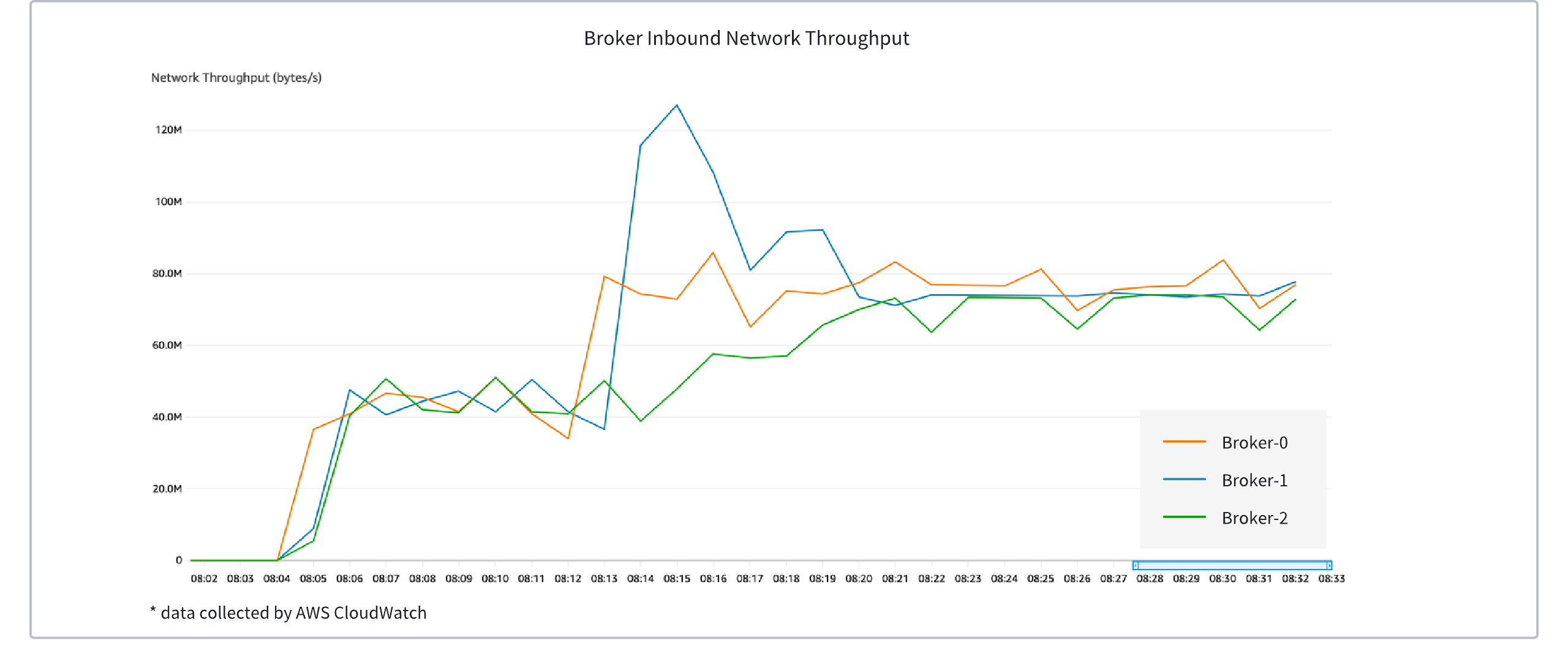 NOTE: In this scenario, to facilitate observation, the partition reassignment cooldown time is manually extended. With the default configuration, the traffic balancing time is approximately 1 minute.