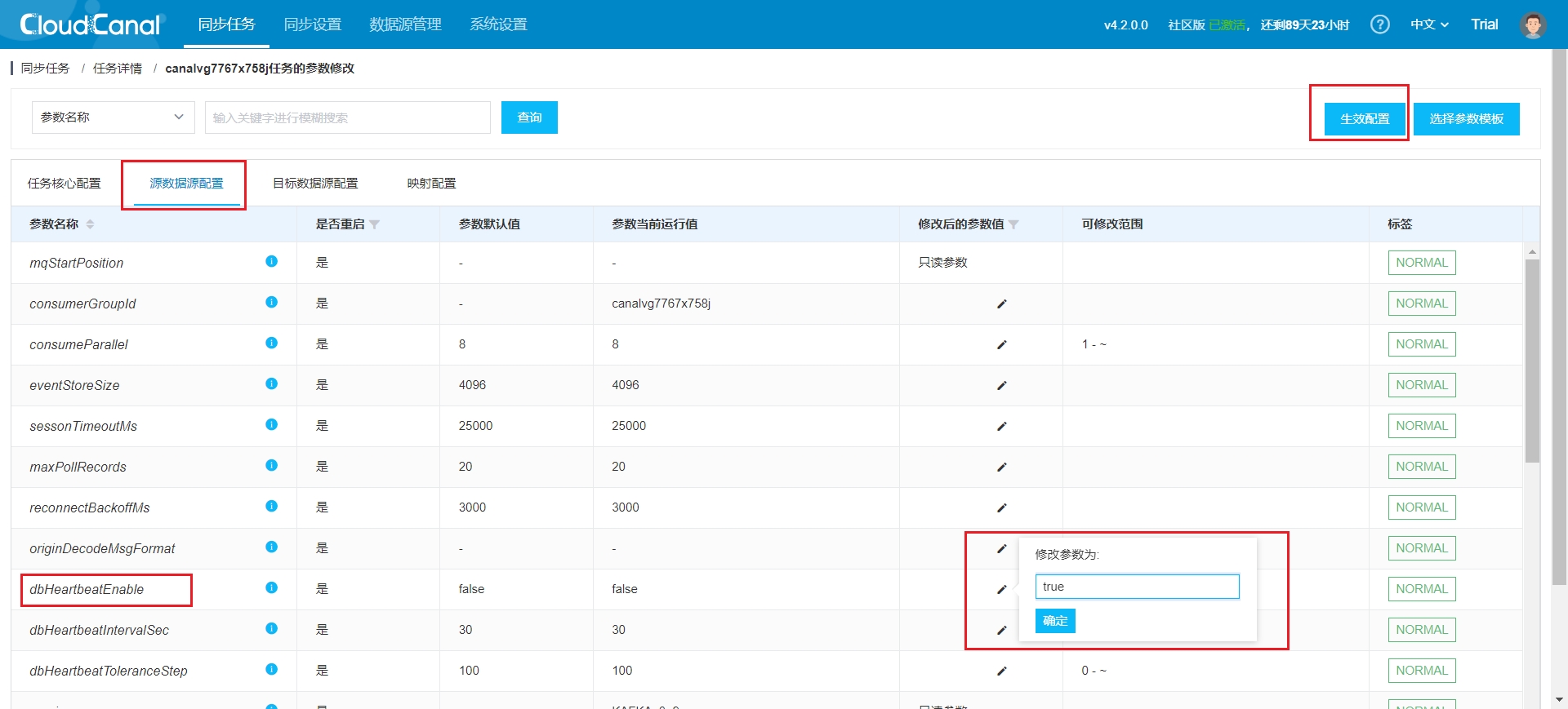 - Once the task is created, it starts automatically and redirects to the task list. You will need to modify the source data source configuration to enable heartbeat configuration, which updates the task status in real-time. Follow these steps: Task Details -> Source Data Source Configuration -> Modify Configuration -> Apply Configuration: