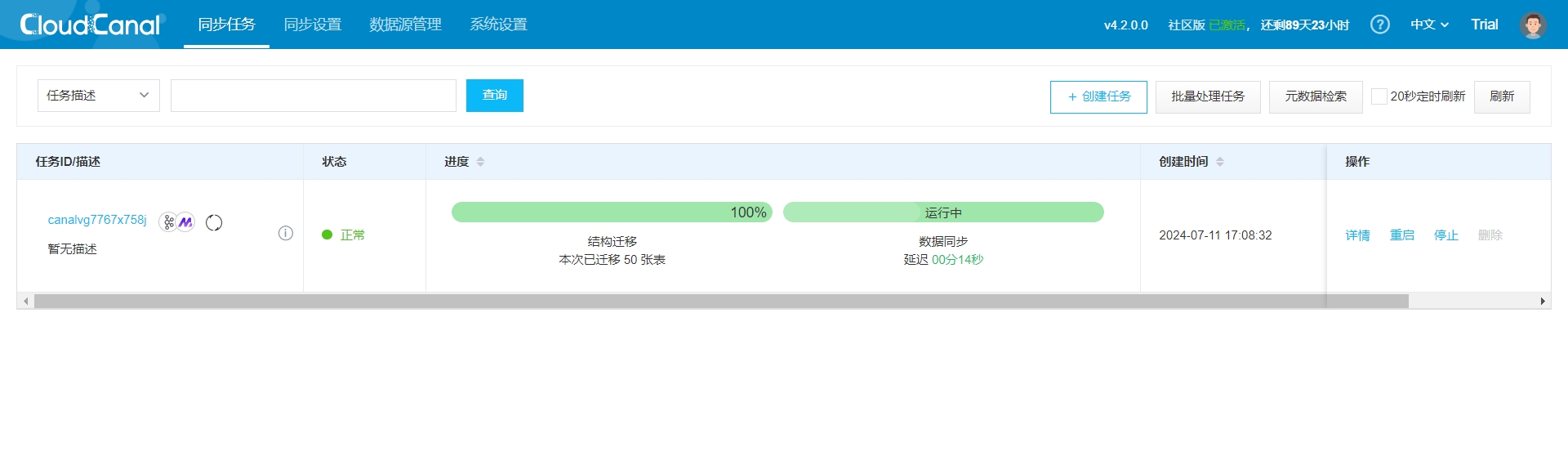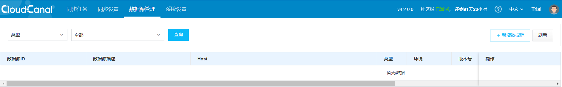 Login successful. Activation of the CloudCanal account is required for normal use. Apply for a free license and activate: License Acquisition | CloudCanal [7]. After successful activation, the main interface status will be: