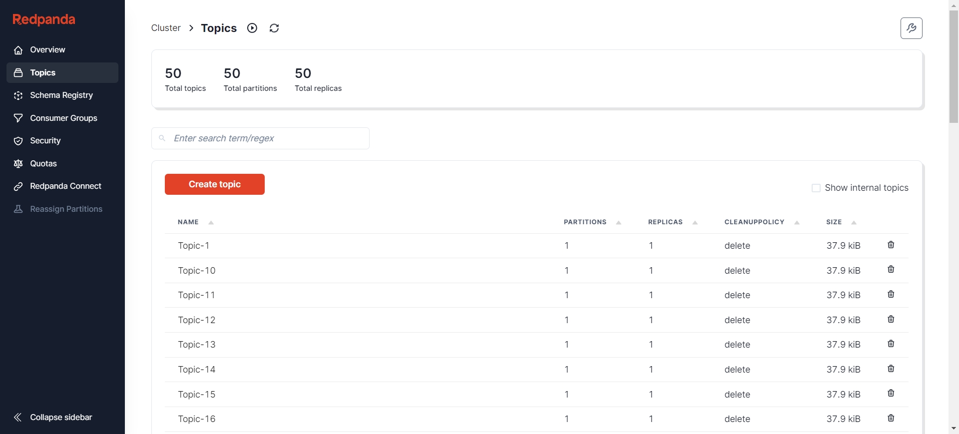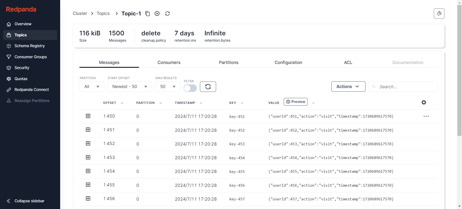 After creation, you can view the status of Kafka nodes through various visualization tools such as Redpanda Console [9], Kafdrop [10], etc. Here, I choose Redpanda Console, where you can see there are already 50 Topics, and each Topic has 500 initial messages.