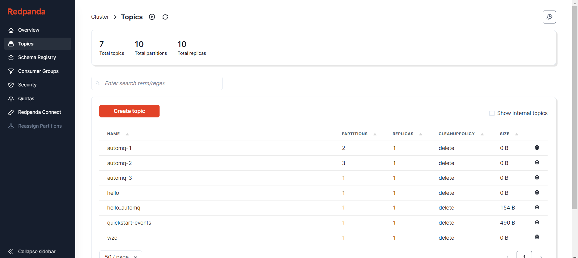 On the Topic list page, users can see a list of all Topics in the current AutoMQ cluster, including key information for each Topic such as the number of partitions and replication strategy. This page allows users to quickly browse and manage Topics.