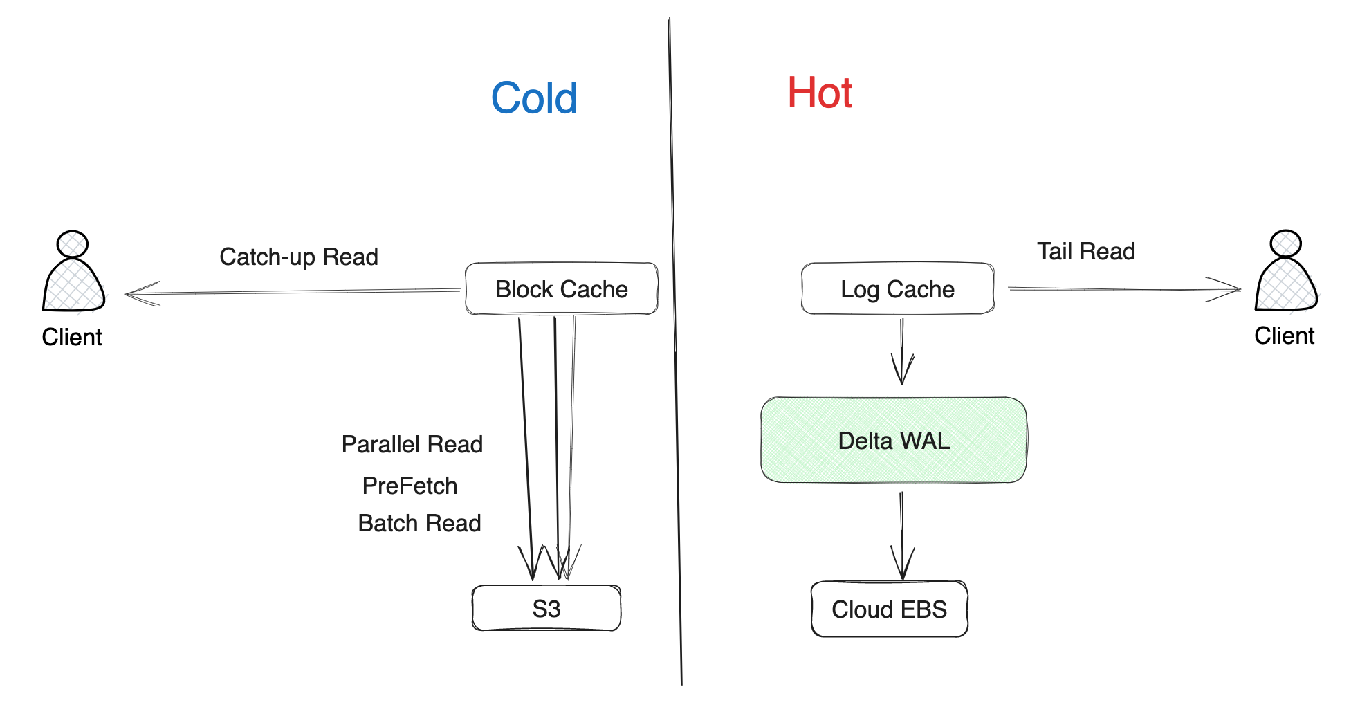 S3Stream has designed a cold-hot isolated cache system that consists of Log Cache (which caches newly written data) and Block Cache (which caches data pulled from object storage). The data in Log Cache will not become invalid in memory before the data in WAL has been uploaded to object storage. If data cannot be retrieved from Log Cache, it will be read from Block Cache instead. Block Cache ensures that even cold reads can hit the memory as much as possible through methods such as prefetching and batch reading, thereby ensuring the performance of cold read operations.