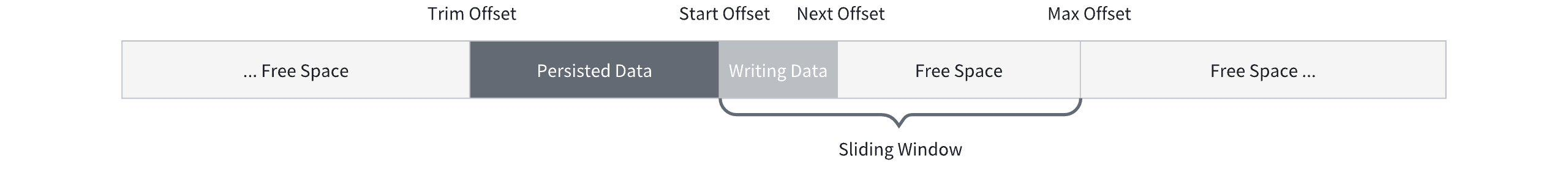 Max Offset : The maximum logical point of the sliding window. When the Next Offset reaches the Max Offset, it will try to expand the sliding window. When the window reaches its maximum length (the slidingWindowMaxLength mentioned in WALHeader earlier), it will pause writing until a record lands and the window slides forward.