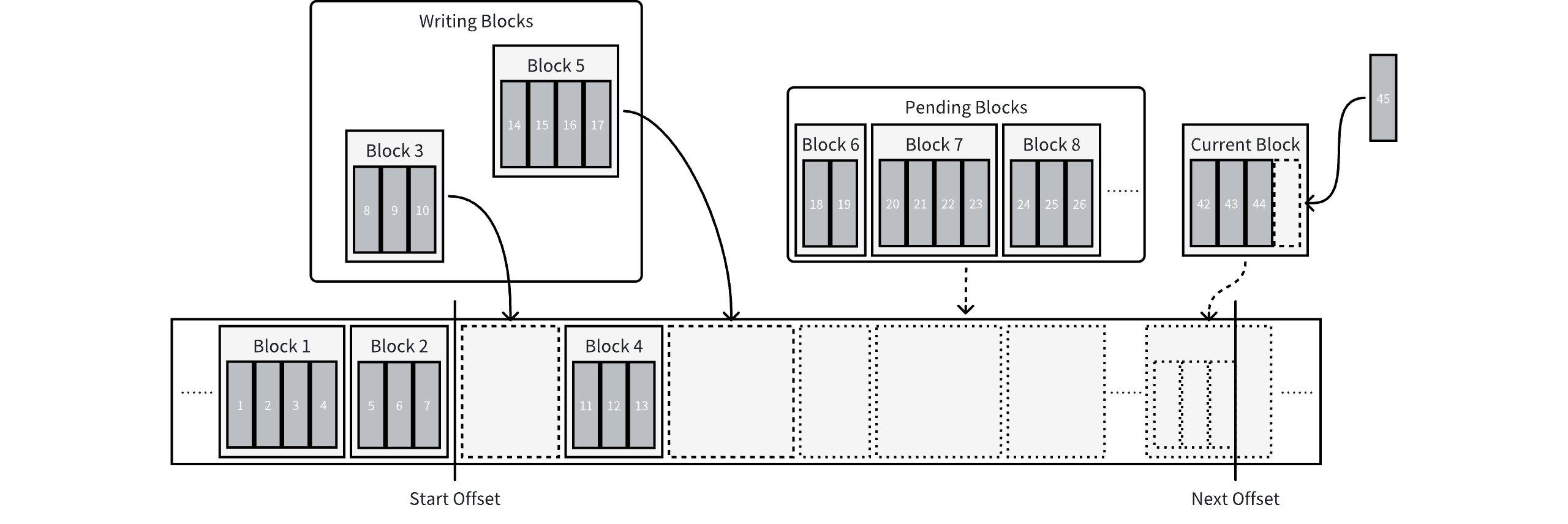 currentBlock : The latest Block. Records that need to be written are placed in this block, which is also responsible for allocating logical offsets for new records. When currentBlock is full, it is placed into pendingBlocks, and a new Block is created and becomes currentBlock.