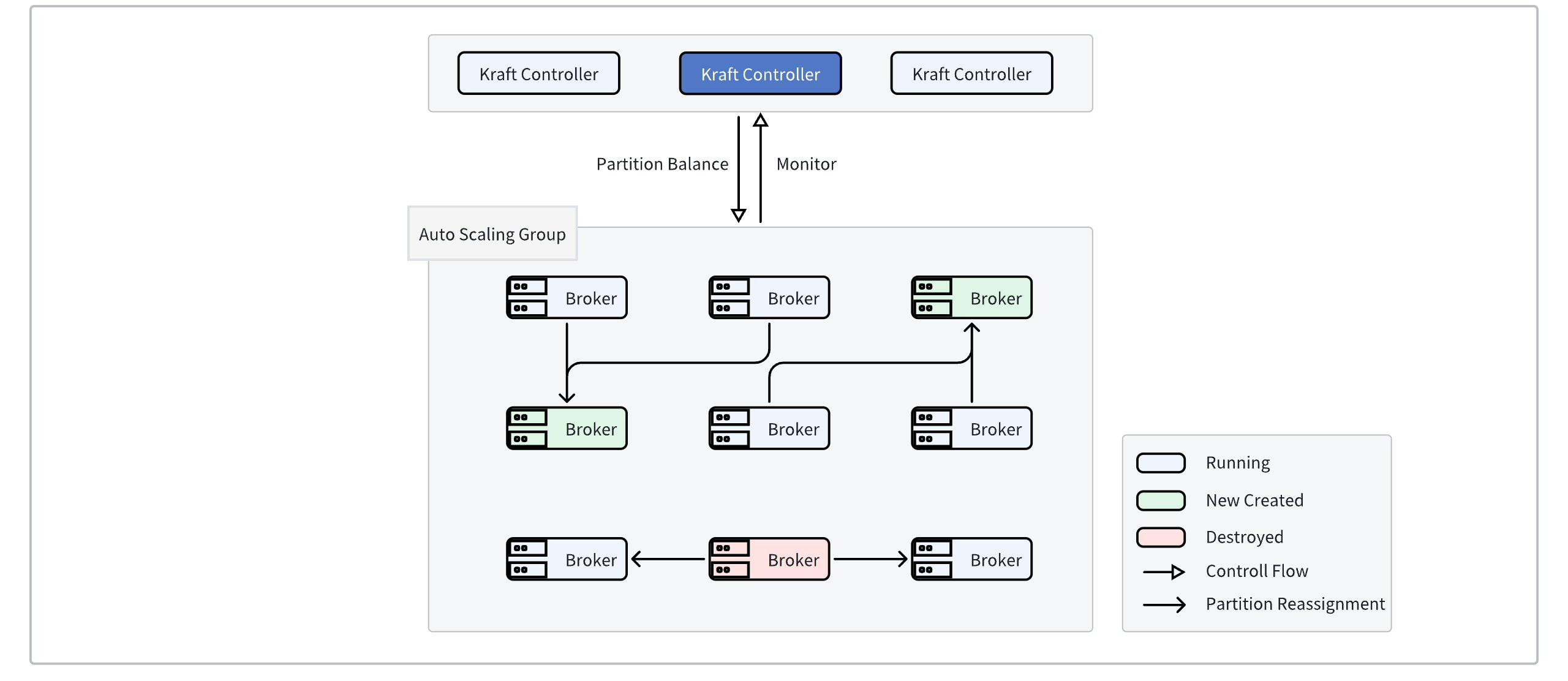 Taking AWS Auto Scaling Groups (ASG) as an example, by configuring traffic threshold monitoring, when the cluster traffic reaches the scaling threshold, new broker nodes are automatically launched. At this point, the Controller detects the traffic imbalance and automatically moves partitions to the newly created brokers, completing the traffic redistribution.