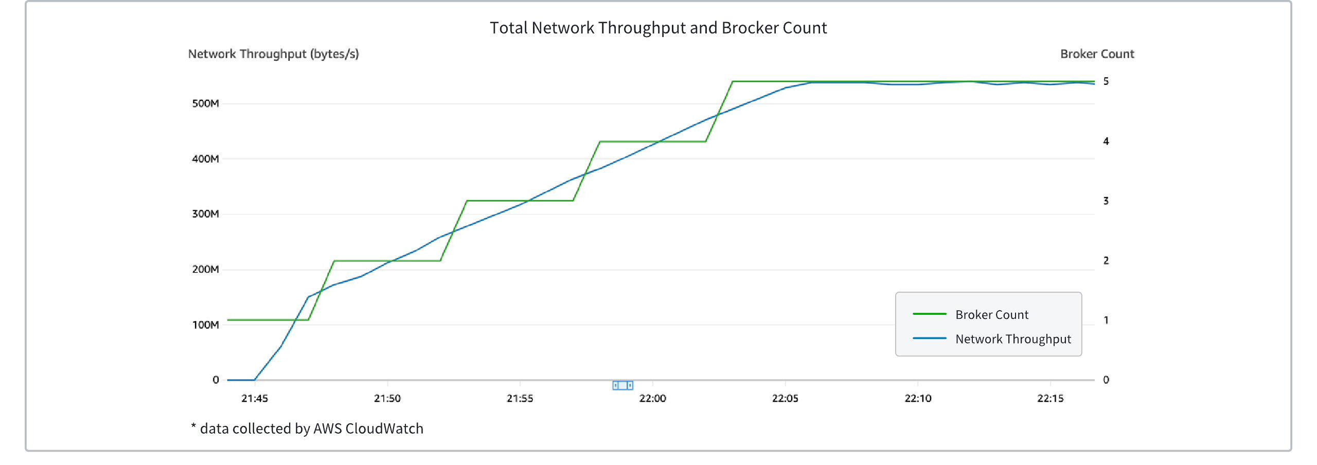 The figure below shows the change in the number of brokers in an AutoMQ Kafka cluster as the traffic increases. It can be seen that brokers are dynamically created and added to the cluster to balance the load as traffic increases linearly.