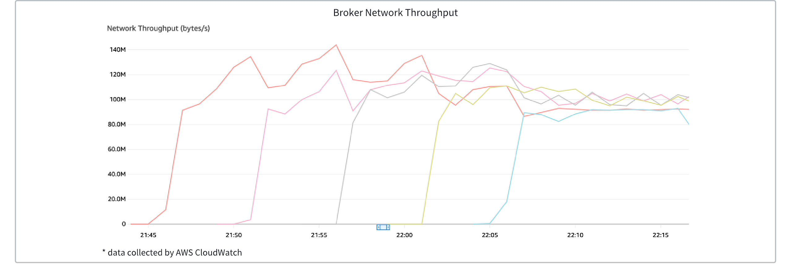 The figure below shows the traffic changes across broker nodes during traffic increases. It can be seen that the newly created brokers complete traffic rebalancing within ten seconds.