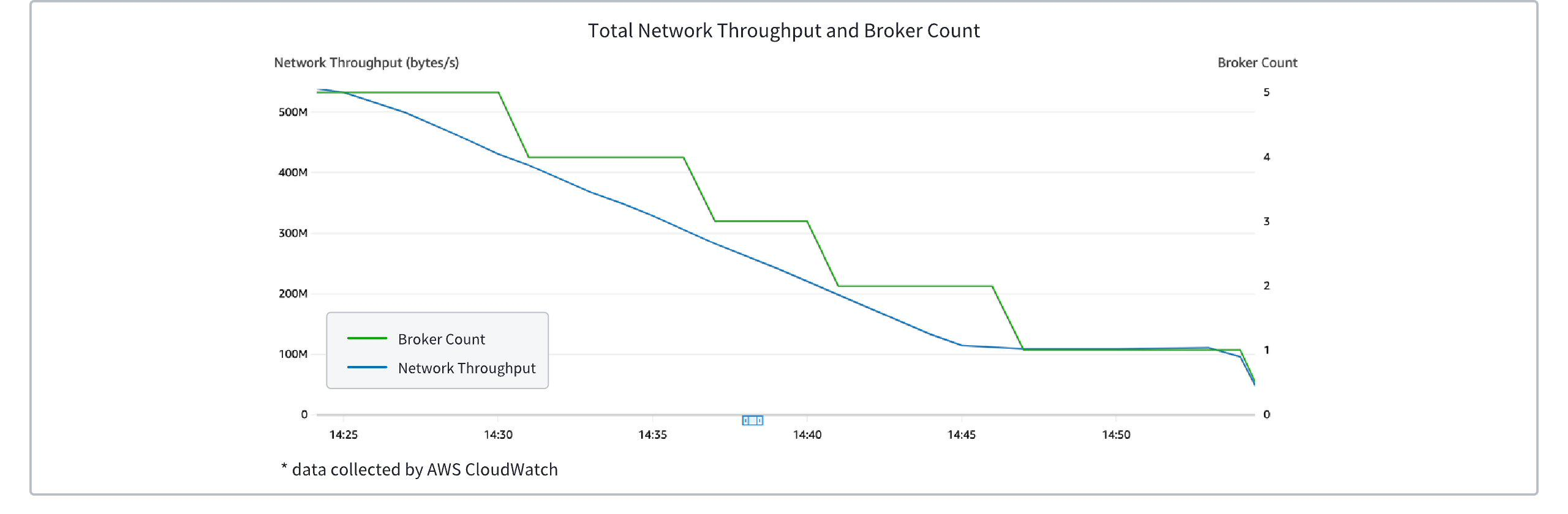 The figure below shows the change in the number of Brokers in an AutoMQ Kafka cluster as traffic decreases. You can observe that as traffic linearly decreases, Brokers are dynamically shut down to save resources.