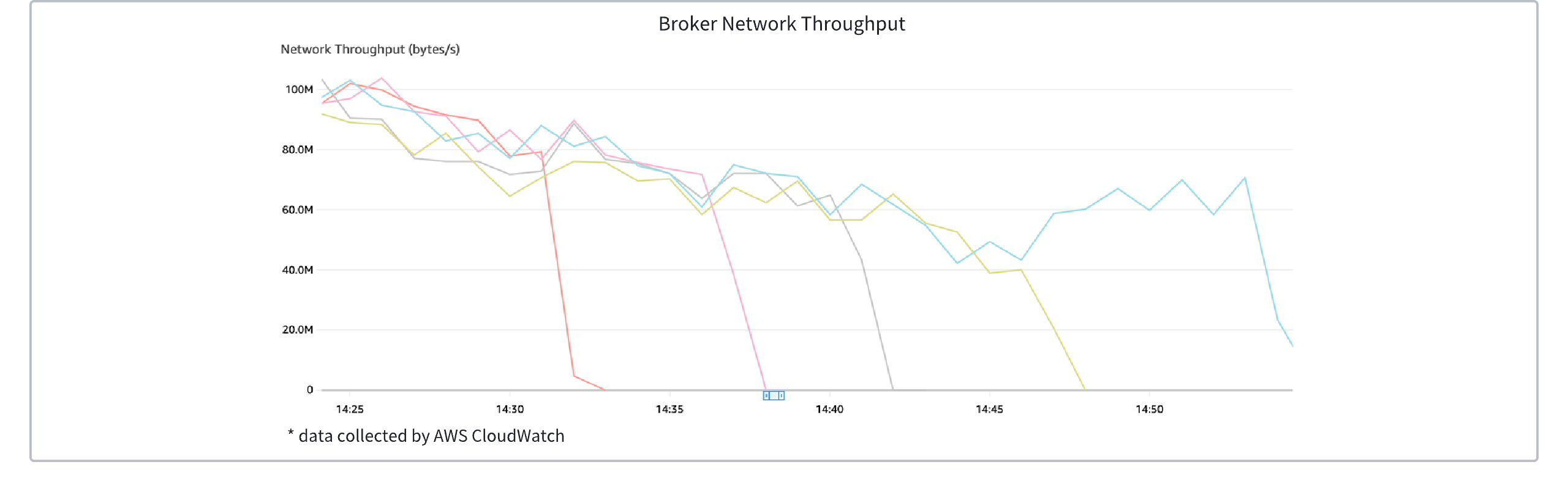 The figure below illustrates the changes in traffic across Broker nodes during traffic decline. It is evident that the load on the shutting down Broker is transferred to the remaining Brokers (whenever a Broker is shut down, the traffic on the remaining Brokers significantly increases).