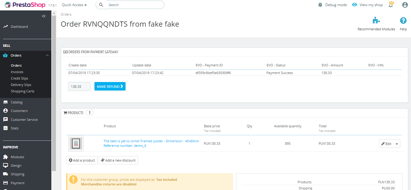 - Scroll to the ‘ORDERS FROM PAYMENT GATEWAY’ panel, input amount to be refunded, then click on the button ‘MAKE REFUND’.