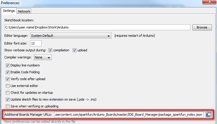 To add board support for our products, go to File > Preferences, and paste this URL into the 'Additional Boards Manager URLs' input field: