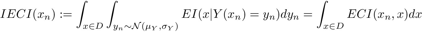text(labels="ECI(xn,x) = E[ EI(x) | yn~Y(xn)] (x50)",x=.3,y=0.045,col='red')And finally, Integrated Expected Conditional Improvement (IECI) calculated at the point xn: