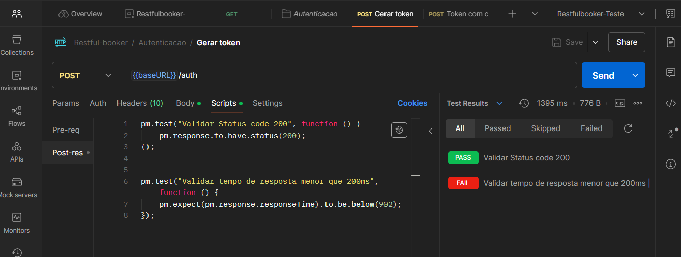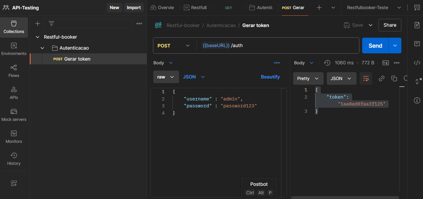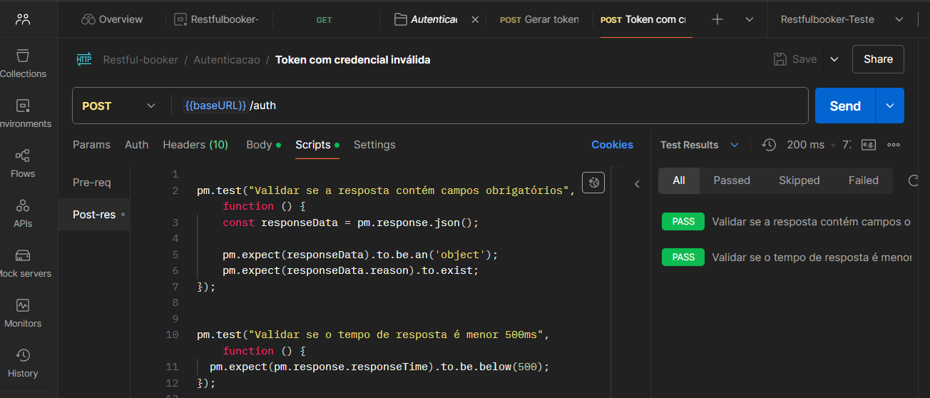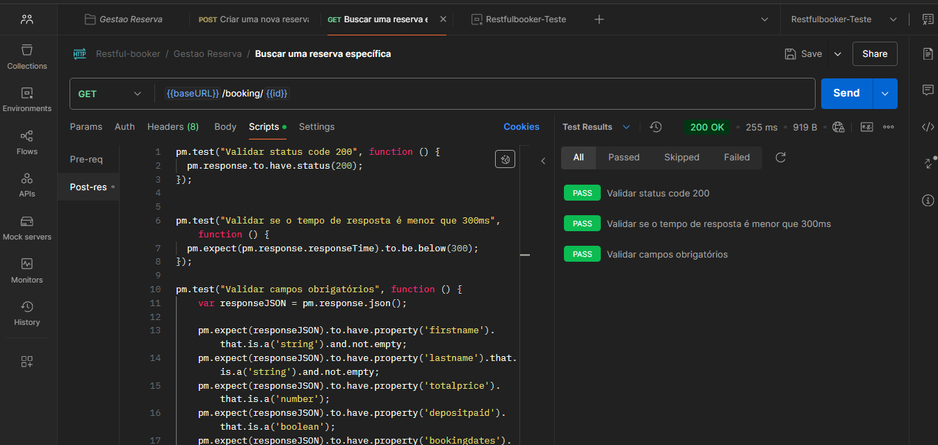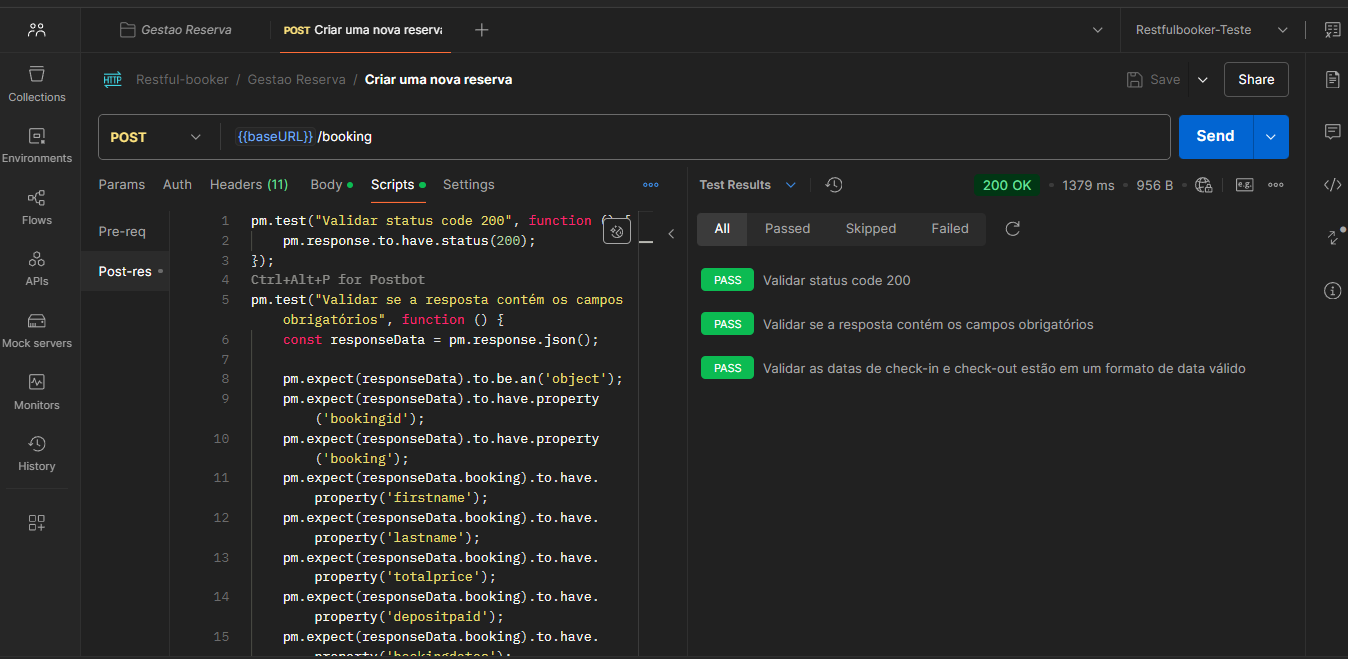 No Postman foi adicionado a collection da API restful-booker, além de realizar os testes de CRUD, também realizei algumas validações, como por exemplo: Status code 200, tempo de resposta, campos obrigatórios, formato da datas entre outros.