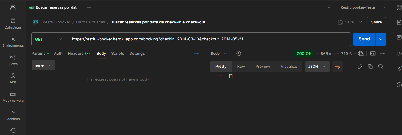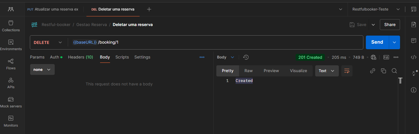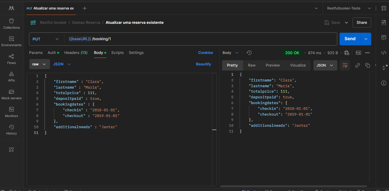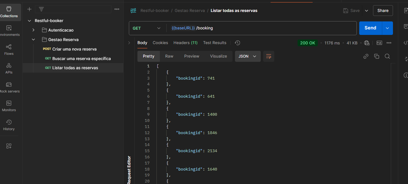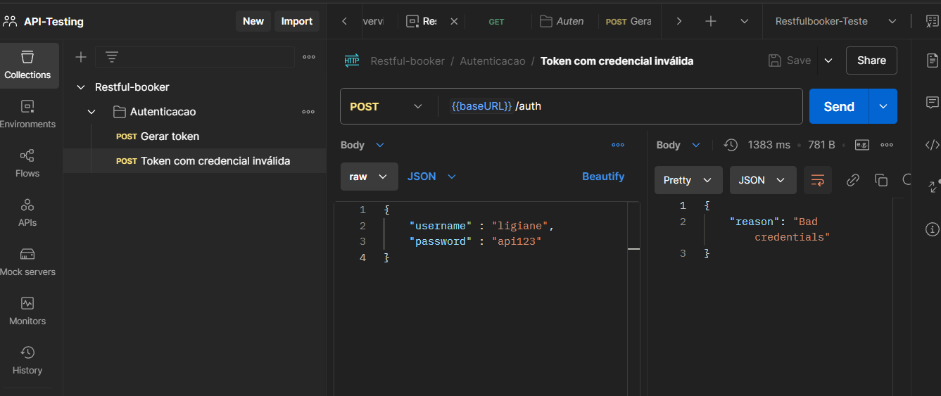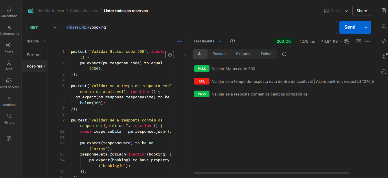 No Postman foi adicionado a collection da API restful-booker, além de realizar os testes de CRUD, também realizei algumas validações, como por exemplo: Status code 200, tempo de resposta, campos obrigatórios, formato da datas entre outros.