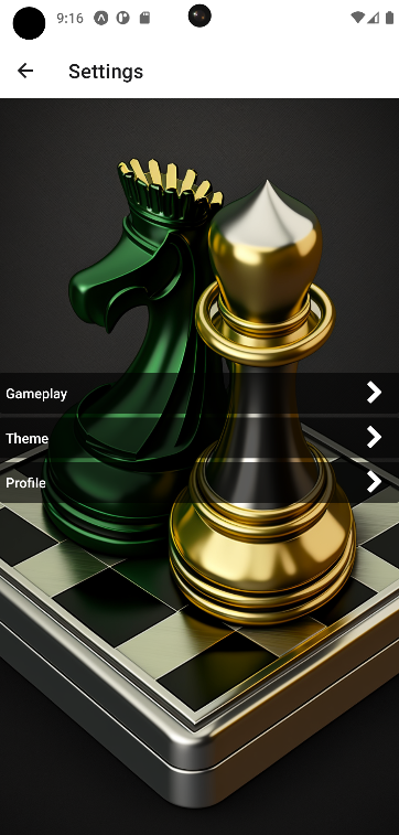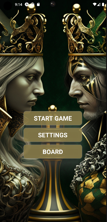First page in the app. The player can choose to start a new game, go to settings or go to the board.