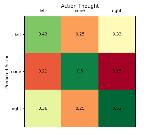 For the "right" thought, we can see the model predicted that correctly 64% of the time, predicted none 16% of the time, and predicted left 21% of the time.