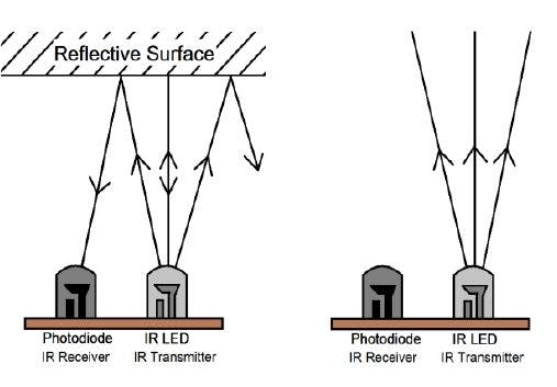 When the IR transmitter emits radiation, it reaches the object and some of the radiation reflects back to the IR receiver. Based on the intensity of the reception by the IR receiver, the output of the sensor is defined.