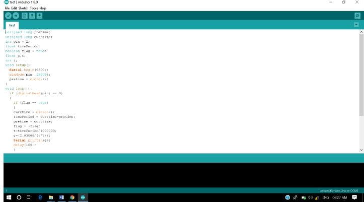 Arduino uses C/C++ code with its own slight modifications. Code has two parts, the major part is to analyze sensor and all determines whether the bob is in the mean position or not. digitalRead() function is used to read the sensor data. If the value is 0 the bob is in the mean position and if 1 it is not. The micros()function is used to measure the time period.