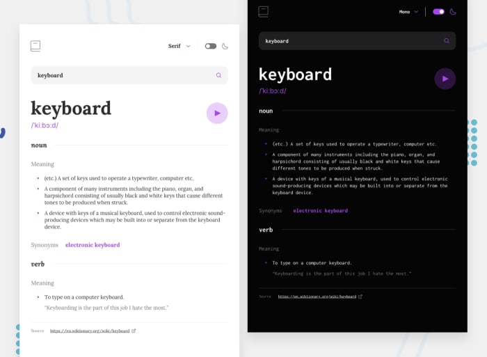Dictionary Web Application - пет-проект, реализованный на основе React.js + TypeScript с использованием архитектурного подхода Feature Sliced Design и Free Dictionary API.