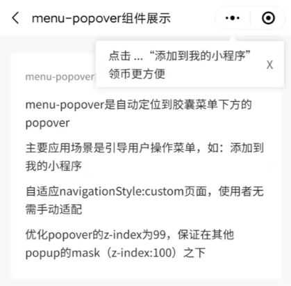的基础上,针对小程序引导添加我的小程序的场景,自动将 popover 定位到小程序胶囊下方 - 组件自动识别页面