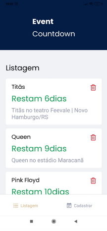 Funcionalidade 1: Listagem de eventos com os dados de titulo do evento, contagem regressiva da data do evento, descrição do evento e opçao de exclusão do evento.