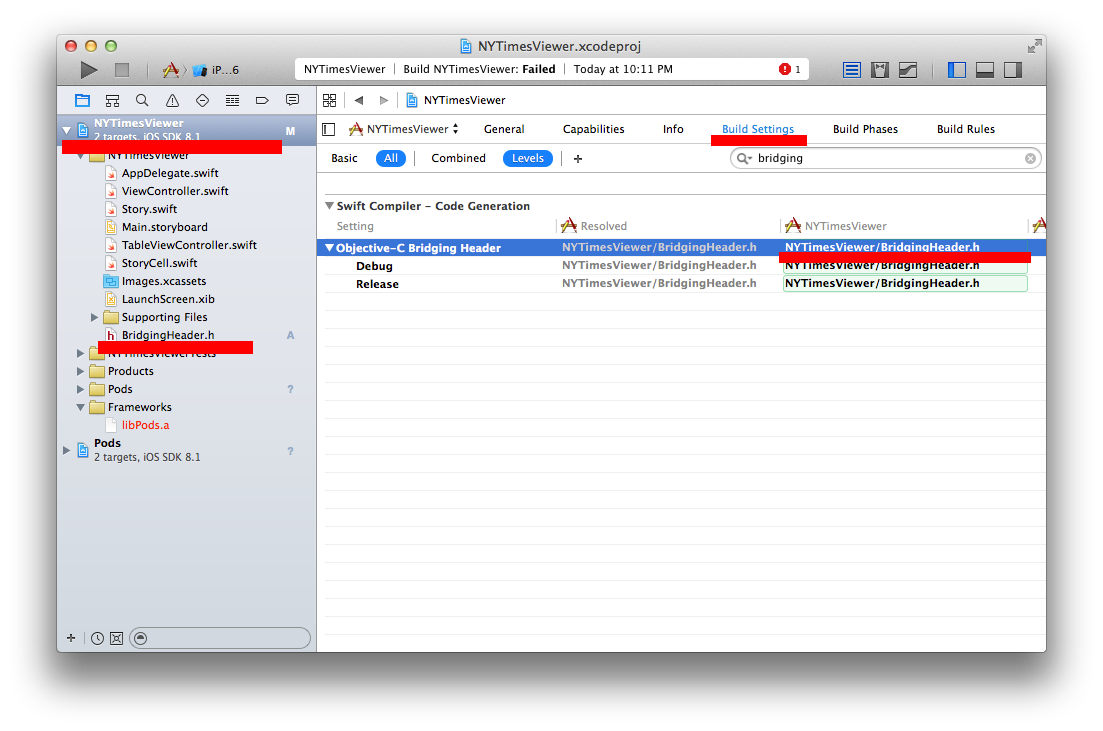 YourProject-Bridging-Header.h, but the name doesn't actually affect