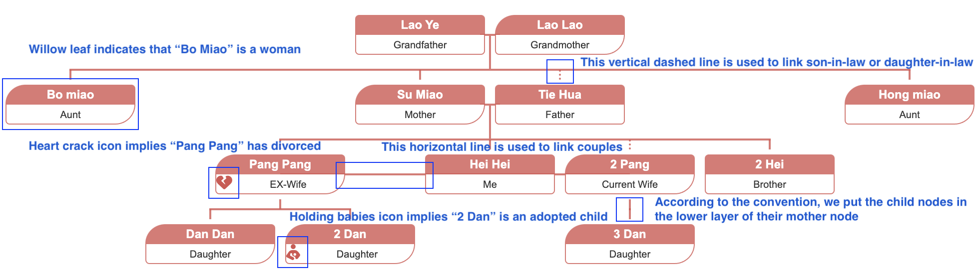 We use the following two-dimensional array datasource to build up the Family Tree. Here, prop "gender" is optional.