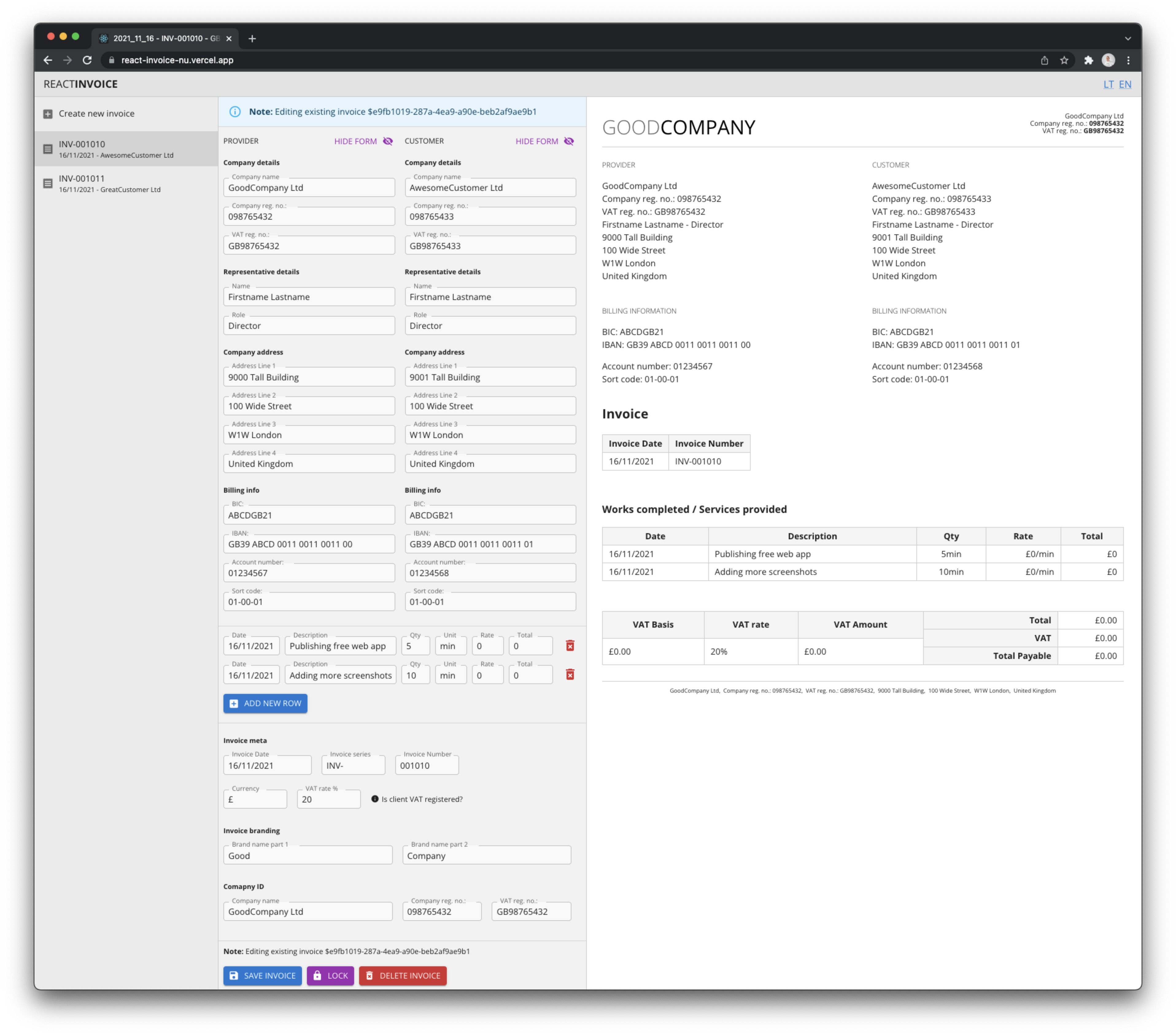 Demo is available here: https://react-invoice-nu.vercel.app/.