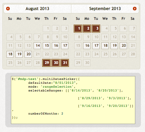 Range selection adds the capability to specify date ranges that are selectable. All dates not in a range are disabled. One click within a range, selects the entire range.