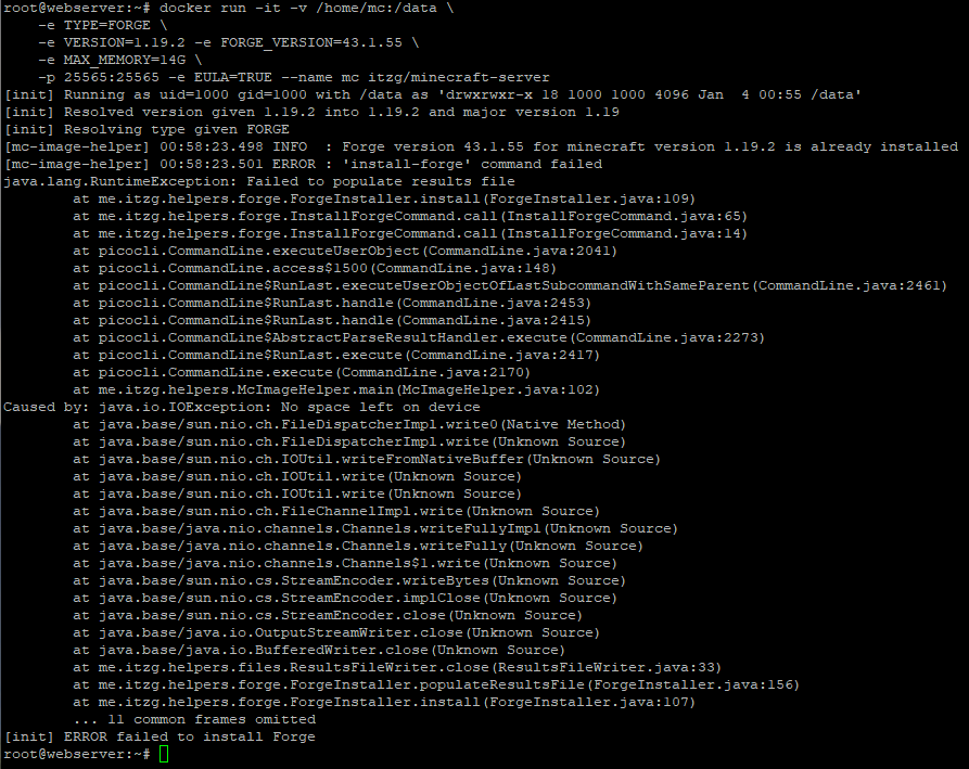 Hello Im a new user to linux and docker. I just started using these a few days ago. The Minecraft Server is a Forge 1.19.2 ATM8 Server running the 1.0.6.b zip from curseforge I was already able to download the image and get a normal forge server to run without any mods (was also able to connect to it) now the next step was to migrate my world directory into the data path aswell as the mods and the config files because i dont wanted to have to go through editing all configs again i already managed to start the server as a container once but after closing it down and trying to restart it again i just get error messages the command i used was: