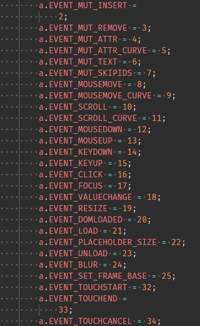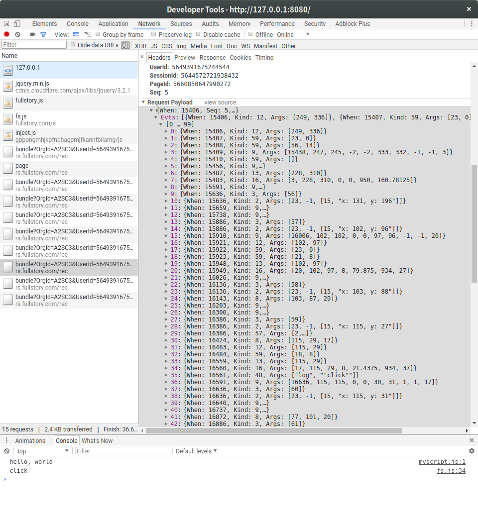 session replay相關服務會請使用者插入一段JS代碼去追蹤使用者的瀏覽狀況,以 Fullstory 為例,它會去監聽使用者的鍵盤滑鼠輸入、移動、點擊等事件(圖1),之後定期回傳至服務的伺服器(圖2)。