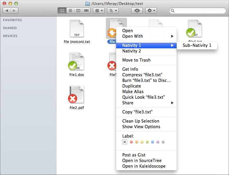 The following example Java code will overlay testFile.txt with testIcon.icns and create a context menu item titled "Nativity Test".