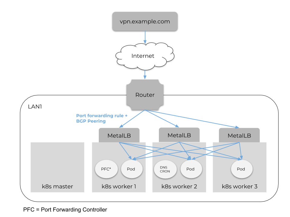 For example, let's say we had three workers (IPs 192.168.1.101, 192.168.1.102, and 192.168.1.103) and one VPN pod on the first worker.