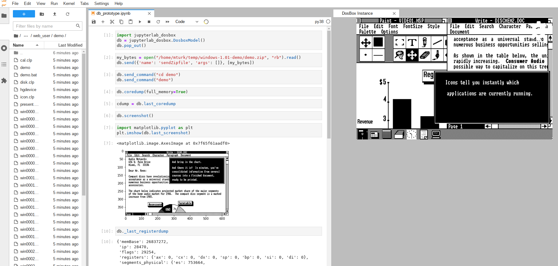 This exposes a pretty simple interface to a WASM-compiled DosBox instance. You can get screenshots, coredumps, and you can send commands. It will download some wasm assets off the web using pooch.
