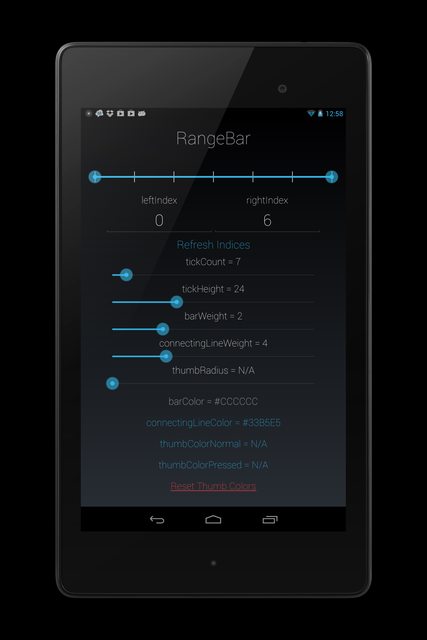 }The RangeBar is similar to an enhanced SeekBar widget, though it doesn't make use of the SeekBar. It provides for the selection of a range of values rather than a single value. The selectable range values are discrete values designated by tick marks; the thumb (handle) will snap to the nearest tick mark.
