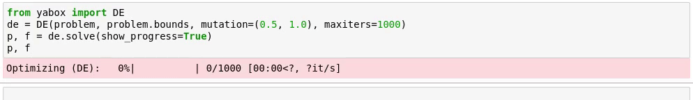 (array([ 0.]), 0.0)Example using Differential Evolution and showing progress (requires tqdm)