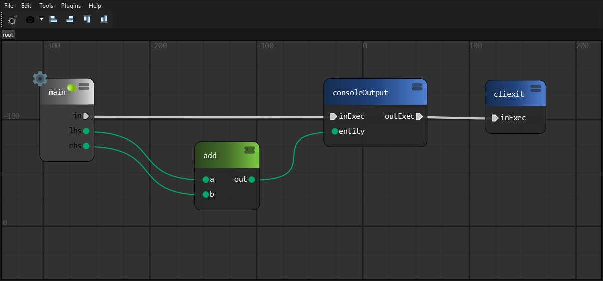 Main logic elements (Node and Pin) has non gui representation, so programs can be evaluated without GUI