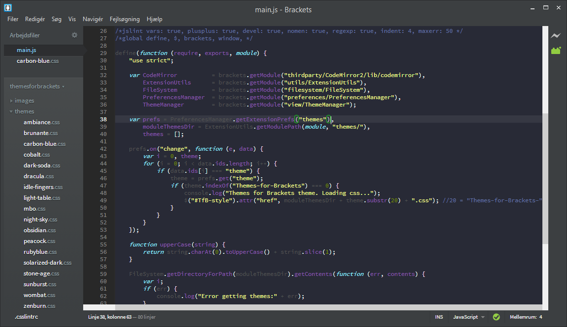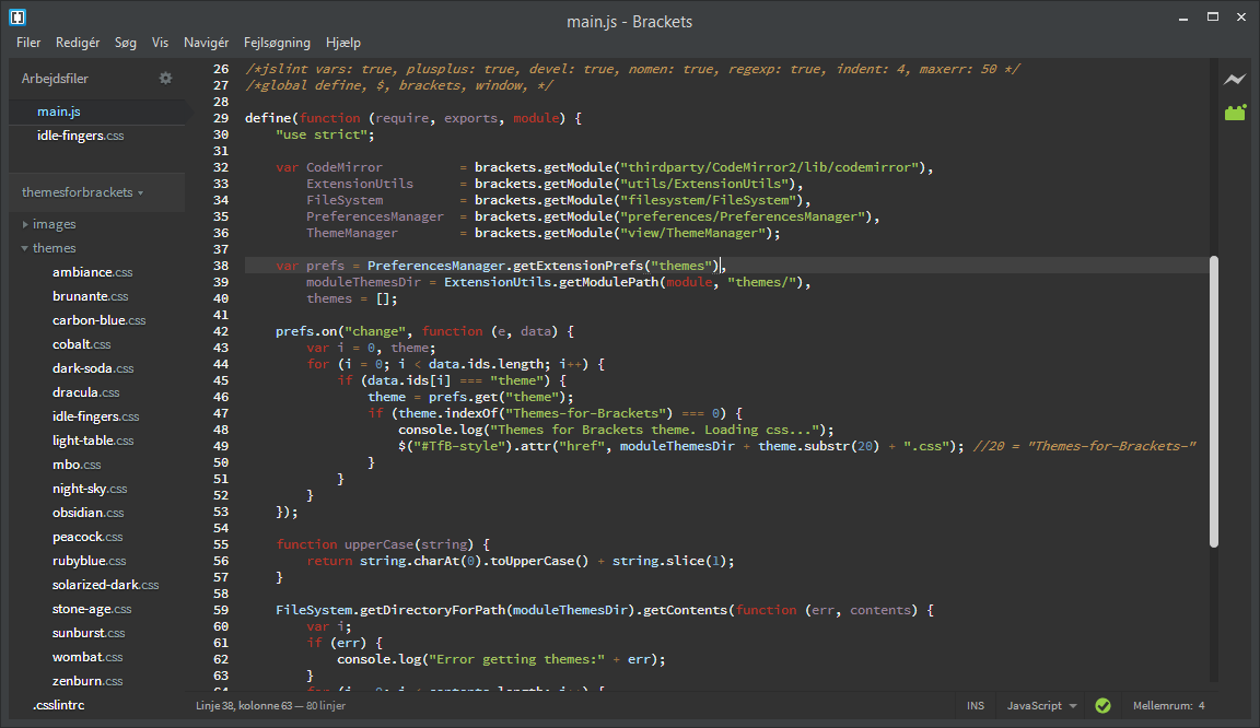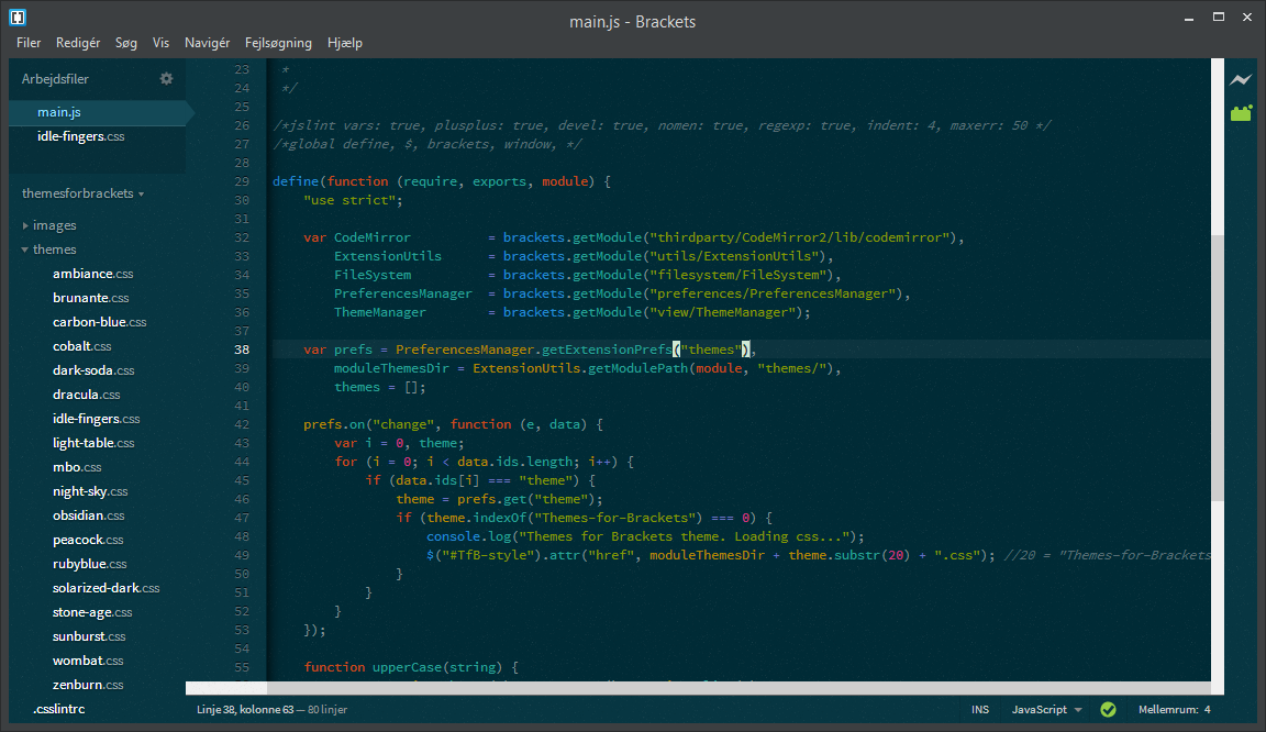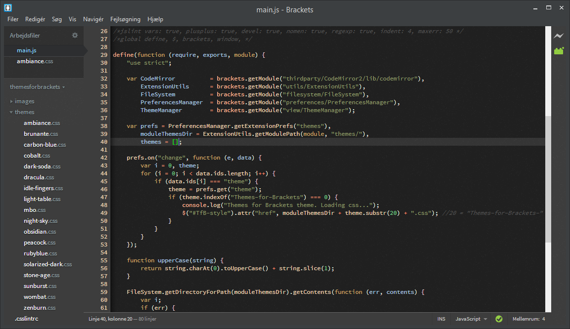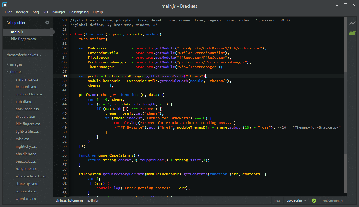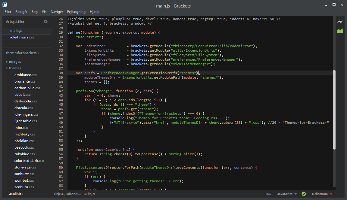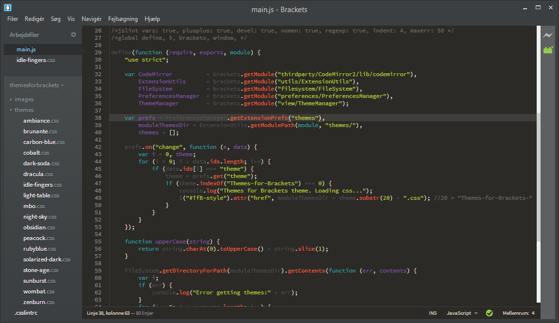 Themes for Brackets was originally an extension which brought themes to the Brackets editor before it had native support for themes. Now Themes for Brackets is a collection of great themes that style all of the Brackets window.