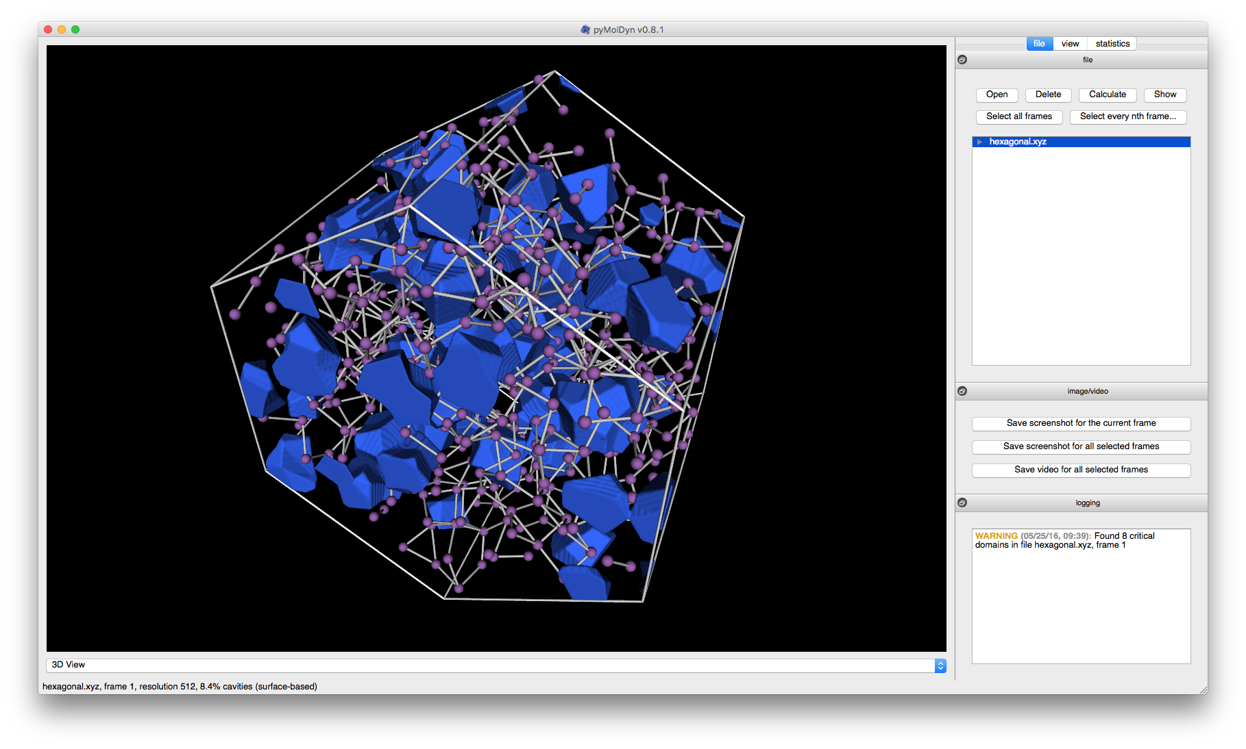 pyMolDyn is a viewer for atomic clusters, crystalline and amorphous materials in a unit cell corresponding to one of the seven 3D Bravais lattices. The program calculates cavities (vacancies, voids) according to three definitions.