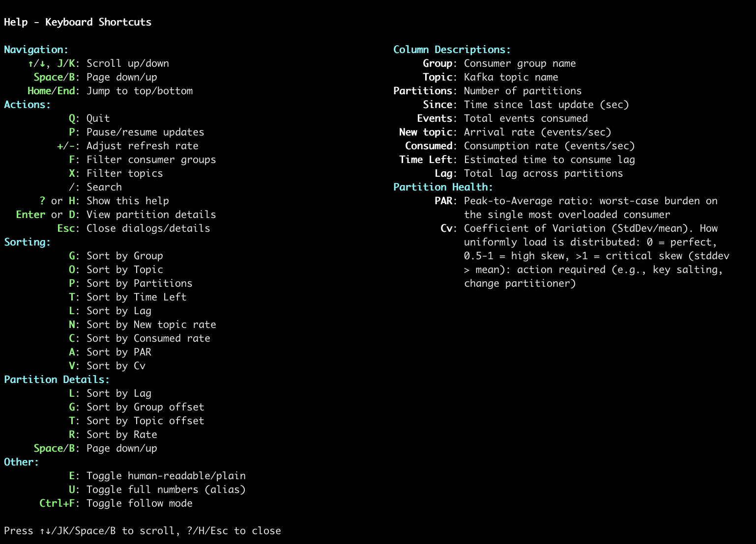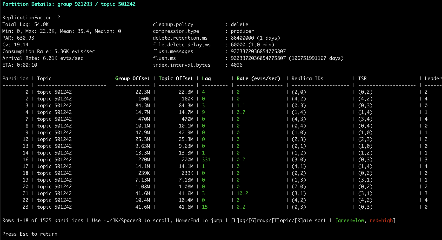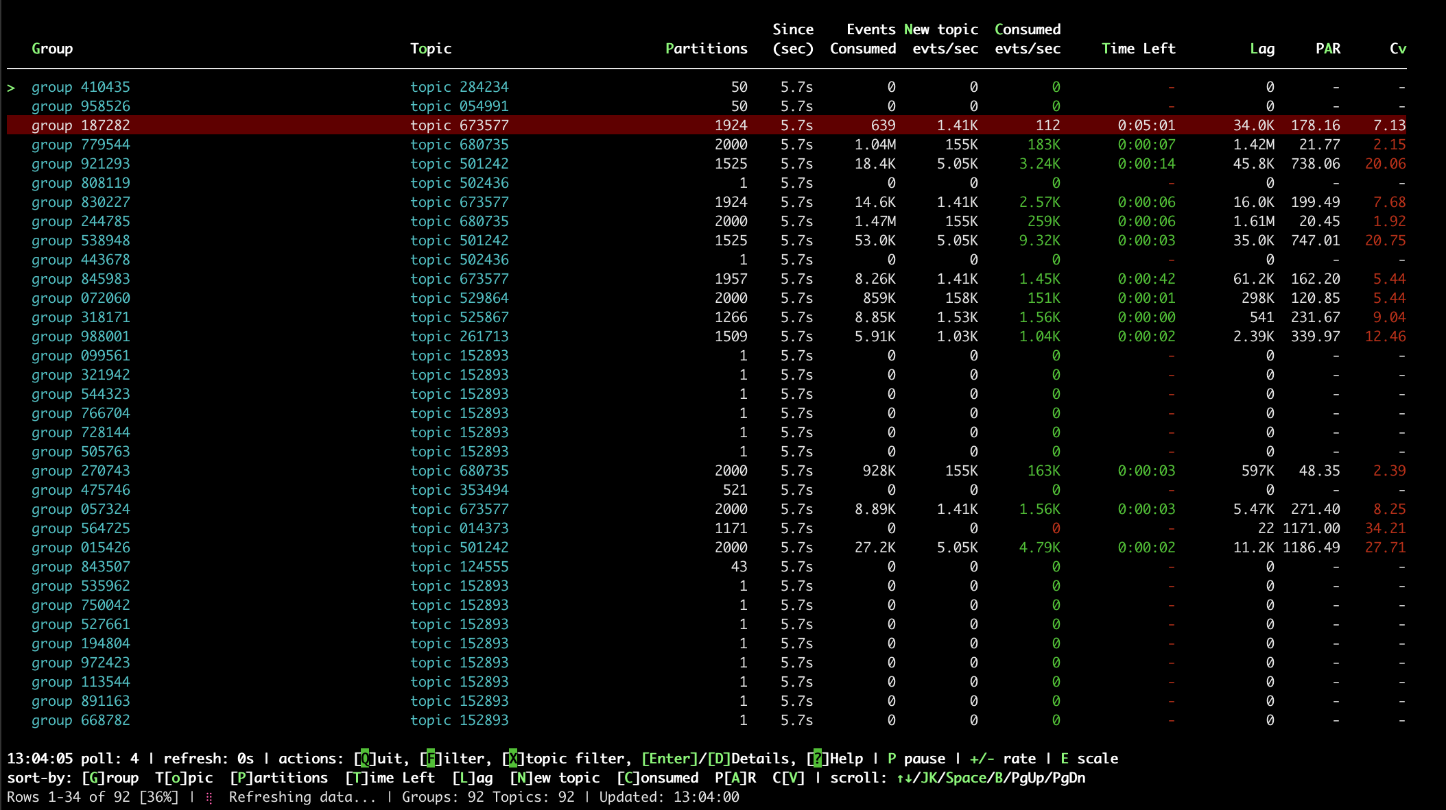 G: Sort by GroupT/o: Sort by TopicP: Sort by PartitionsT: Sort by Time Left (ETA)L: Sort by LagN: Sort by New topic rateC: Sort by Consumed rateA: Sort by PAR (Peak-to-Average Ratio)V: Sort by Cv (Coefficient of Variation)