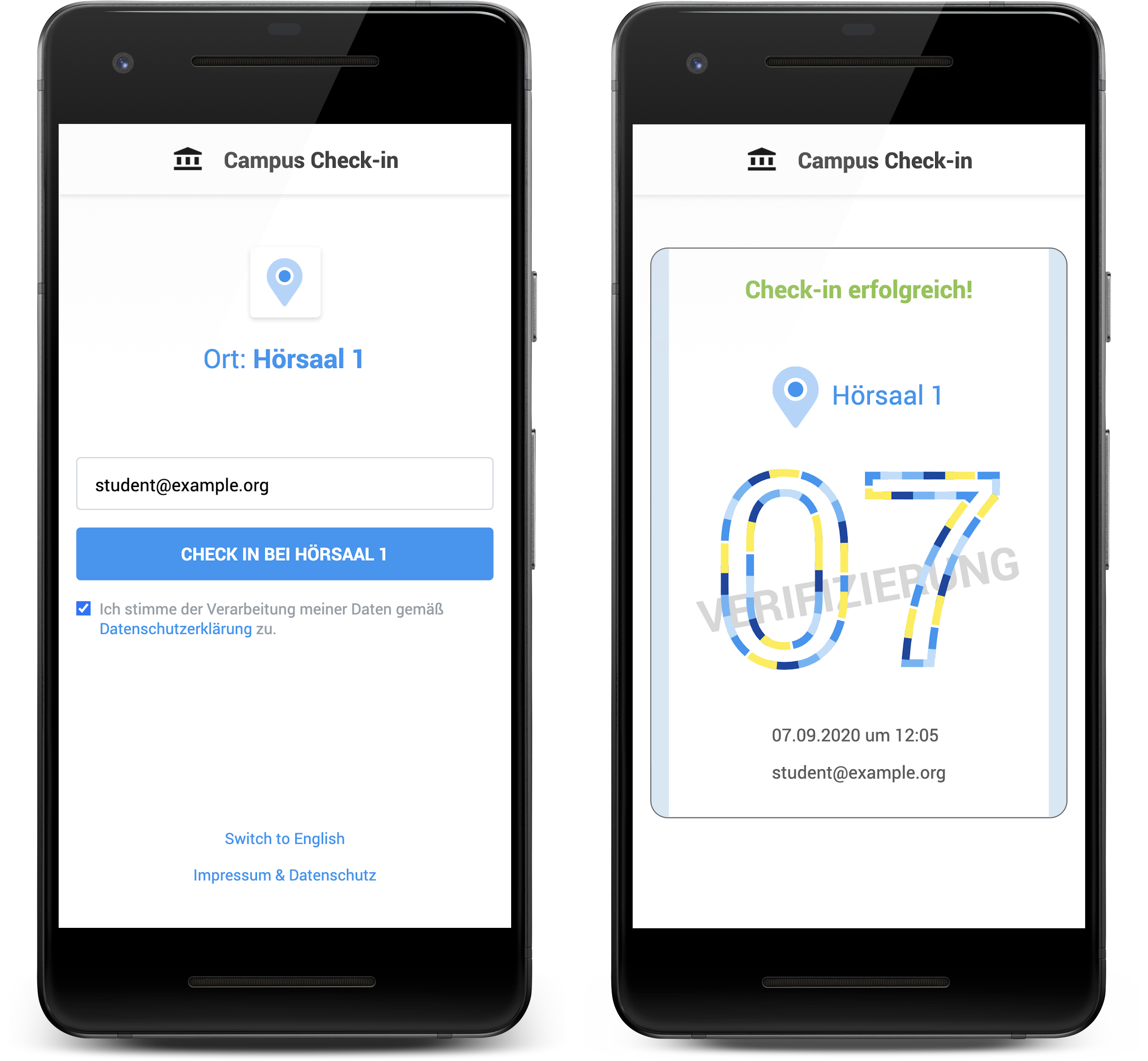Campus QR can additionally be used as access management system: Access to locations like department buildings is only granted by explicit invite. Users scan the QR code attached to the entrance. If access is granted, a unique animation with access information is shown at the users mobile device to allow entrance by a doorman or web-hook based door unlocking systems. Access control or successful check-ins can also be verified by an employee during a lecture in bulk, so lecturers can validate within seconds if hundreds of students have successfully checked in.
