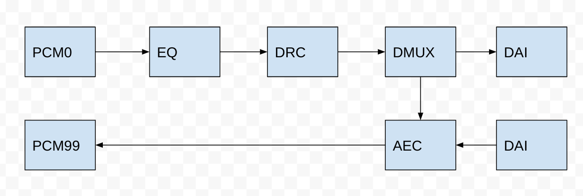 Thanks for the picture. I would place AEC up one layer and have and leave gains there after AEC as placeholder for other processing. Gain may be needed for mic mute feature anyway with some device button & led. But it depends on what the google rtc aec topology requirement is. Can you please comment @cujomalainey @johnylin76 . |